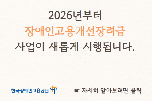 기업의 점진적 장애인 고용의무 이행을 유도하고 중증장애인 일자리 창출을 위해 2026년부터 「장애인고용개선장려금」 사업을 시행합니다.