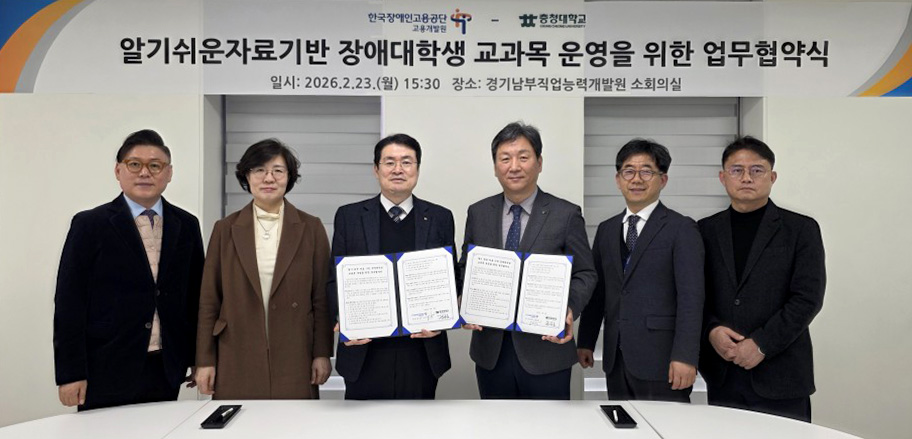 | 1708 | 충청대학교-한국장애인고용공단 고용개발원, 「알기 쉬운 자료 기반 장애대학생 교과목 운영을 위한 업무협약」 체결 | 2026-02-23 |