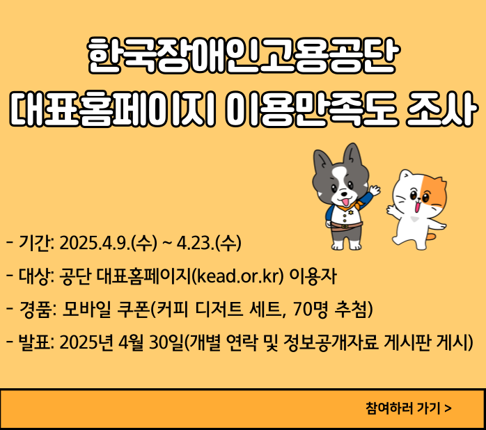 한국장애인고용공단(이사장 이종성)은 4월 9일부터 23일까지‘2025년도 대표홈페이지 이용만족도 조사’를 실시한다고 밝혔다.